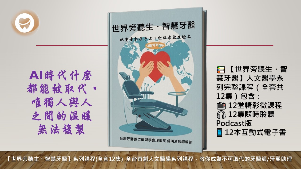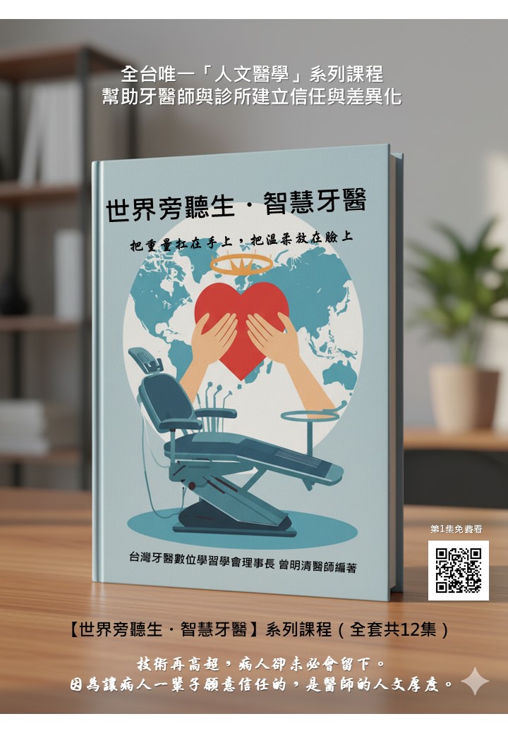 這份啟發,催生了【世界旁聽生・智慧牙醫】系列課程(共12集)。這不只是課程,更是一場「人文醫學與智慧牙醫」的跨界對話。我希望透過Podcast、線上課程與多媒體電子書,帶領年輕一代牙醫師與牙醫助理,看見專業之外的溫度,體會「技術是重量,慈悲是溫柔」。